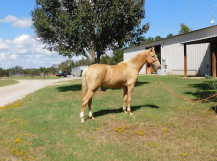 7 year old, Saddlebred X, gelding, palomino, 16 hands. An in your pocket sweet and sensitive horse. Will follow you like a dog anywhere you go. Easy to ride and very safe dead broke horse. Has some go and would make an excellent barrel horse. His gaits are easy to sit to. This is your horse if you like one with some go. He is not for a beginner.